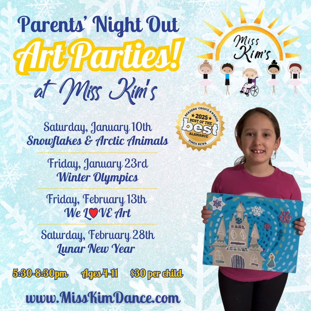 Let’s Celebrate with ART with Miss Katy and Miss Darcy at our Next Parent’s Night Out! Wear clothing that may get messy. Send a peanut free snack and a labeled water bottle.