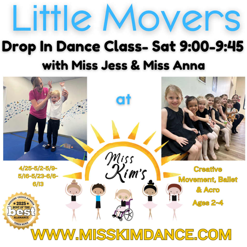 Our Little Movers Drop-In Dance Class is the perfect introduction to the joy of dance! This playful class blends creative movement, ballet basics, and beginner acro to help young dancers build coordination, confidence, and imagination while having lots of fun.